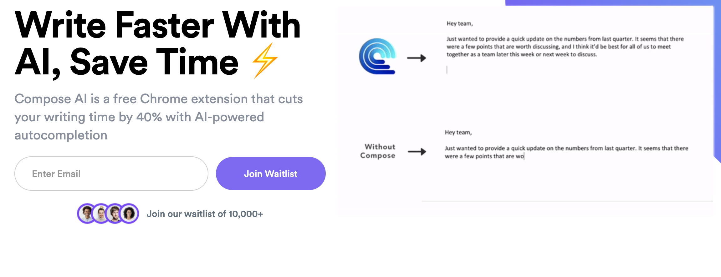 How does Compose AI explain itself in the first minute? The strap-line on the Compose AI website reads “Write Faster With AI, Save Time”.