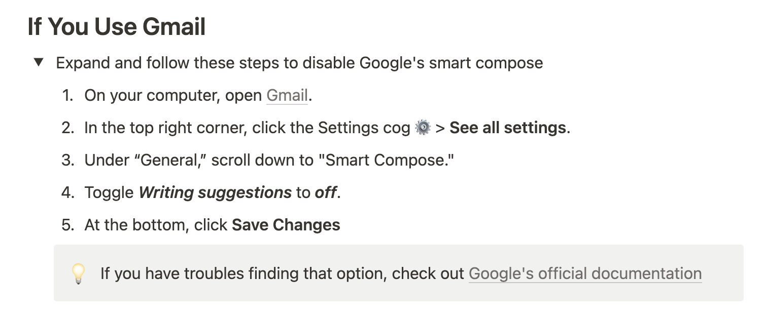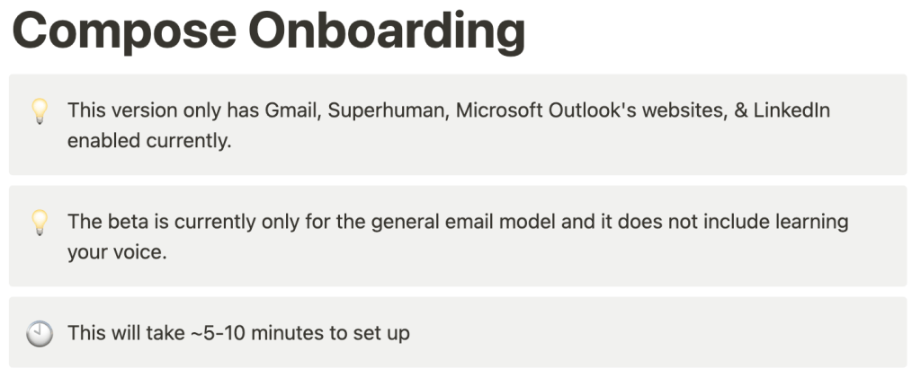 When I sign up to join the waitlist for Compose AI, I get access to a Notion page which contains onboarding information, getting people set up and using the tool.