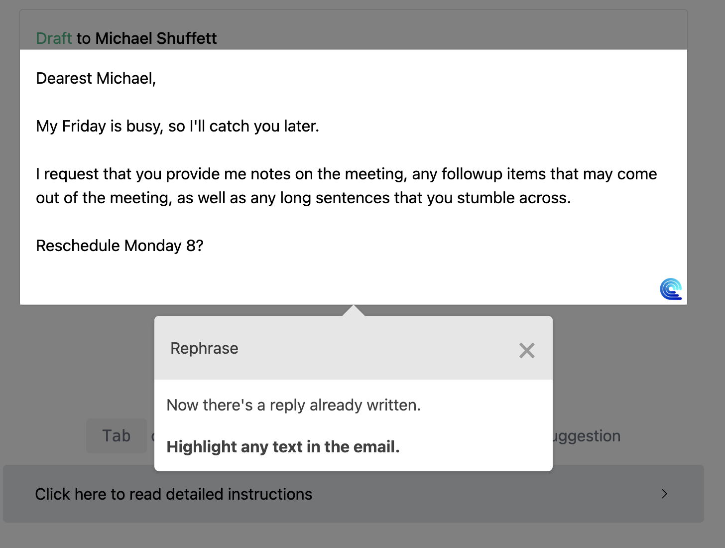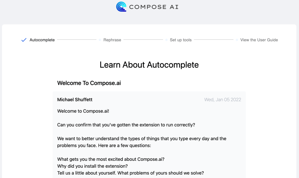 The product tour that Compose AI offers feels very intuitive; a few key steps and related instructions to get me started. I get a sense of the functionality – e.g. suggested phrases to insert in an email – and can already see the benefit of using the product.