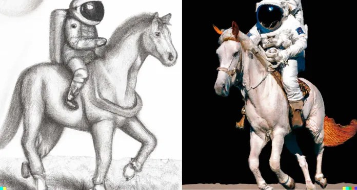 The visual style of the image is set through the description, varying from realistic to fantastic. In the example below, the images are generated from the description “An astronaut riding a horse”; the first description ends with “as a pencil drawing” and the second one “in photorealistic style.”