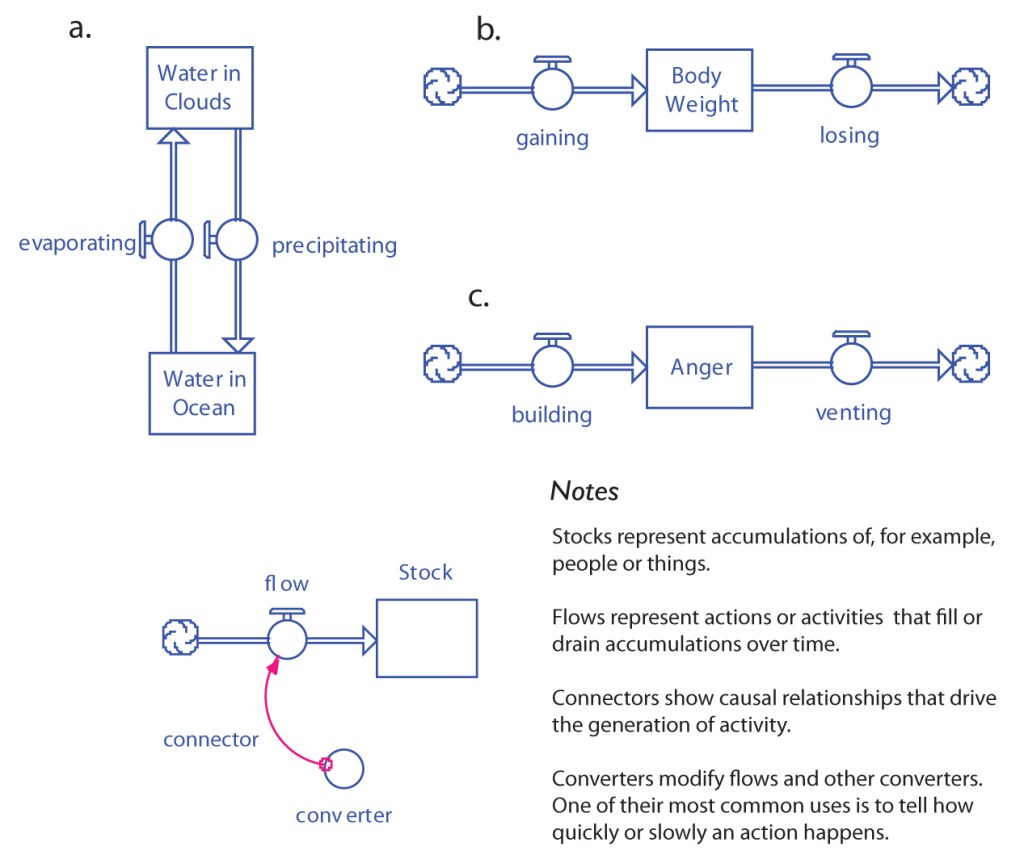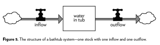 In “Thinking in Systems” Meadows covers the three aspects of any system in detail: elements, interconnections and purpose. First, she introduces the concept of ‘stock’. A stock is the foundation of any system. Stocks are the elements of the system that you can see, feel, count or measure at any given time.