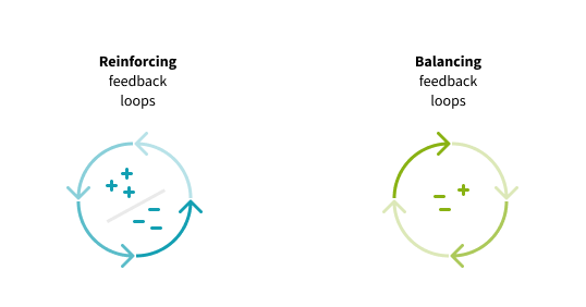 In contrast, ‘reinforcing’ loops are found where elements of a system can reproduce themselves or grow continuously, so that the system amplifies. This amplifying effect can lead to growth or destruction.
