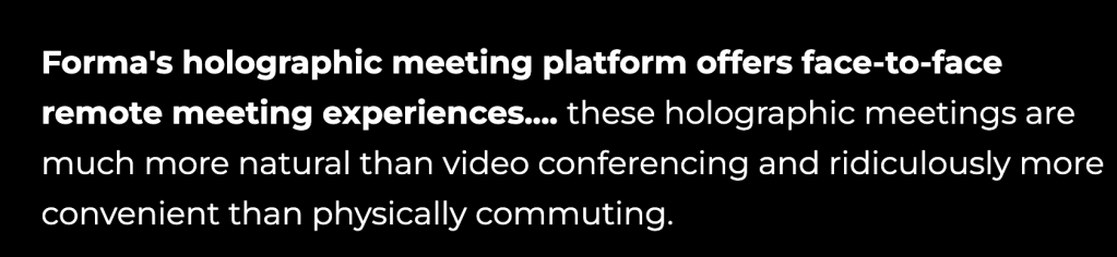 Main learning point: Clearly early days for volumetric video technology but I can see the appeal of applying this technology to remote meetings. Instead of using avatars, Forma Vision creates holograms of meeting participants to make meetings feel more engaging and interactive.