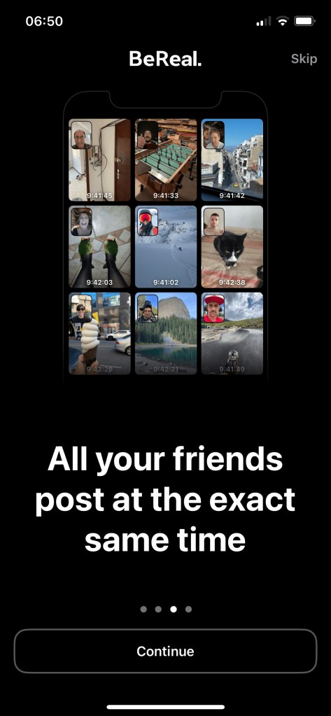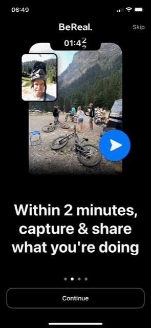 What happens next? I see a number of introductory screens that quickly explain how BeReal works: users have max. 2 minutes to record a snapshot of what they’re doing, with your friends sharing their snapshots at exactly the same time.