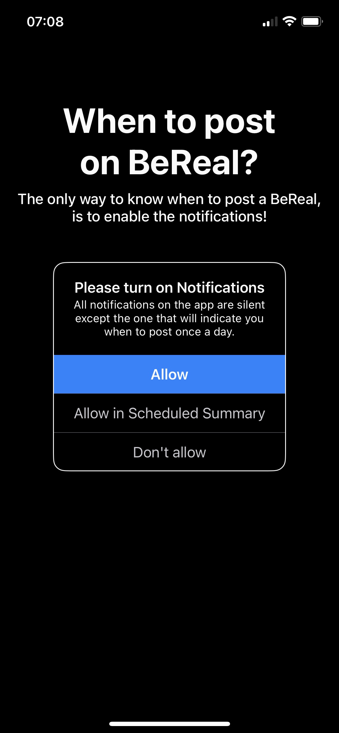 Onboarding on BeReal is straightforward and as you would expect. At the end of the onboarding process, there’s a screen urging me to allow notifications as “the only way to know when to post a BeReal!”