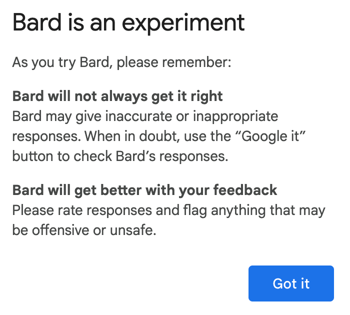 I click on the call to action in the invite email, I’m directed to Bard. The first thing I see is a popup that highlights the experimental nature of Bard: