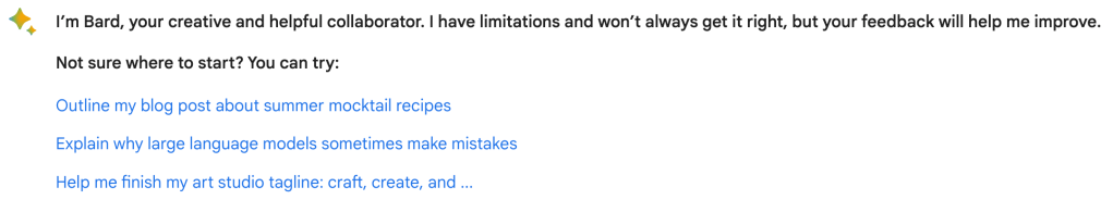 How does Bard explain itself in the first minute? – The invite to try out Bard describes it as “your creative and helpful collaborator, here to supercharge your imagination, boost your productivity, and bring your ideas to life.”