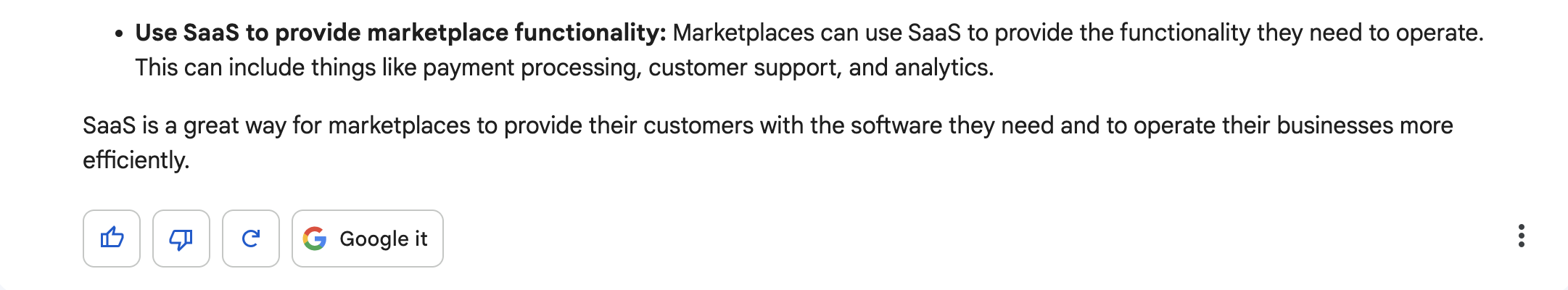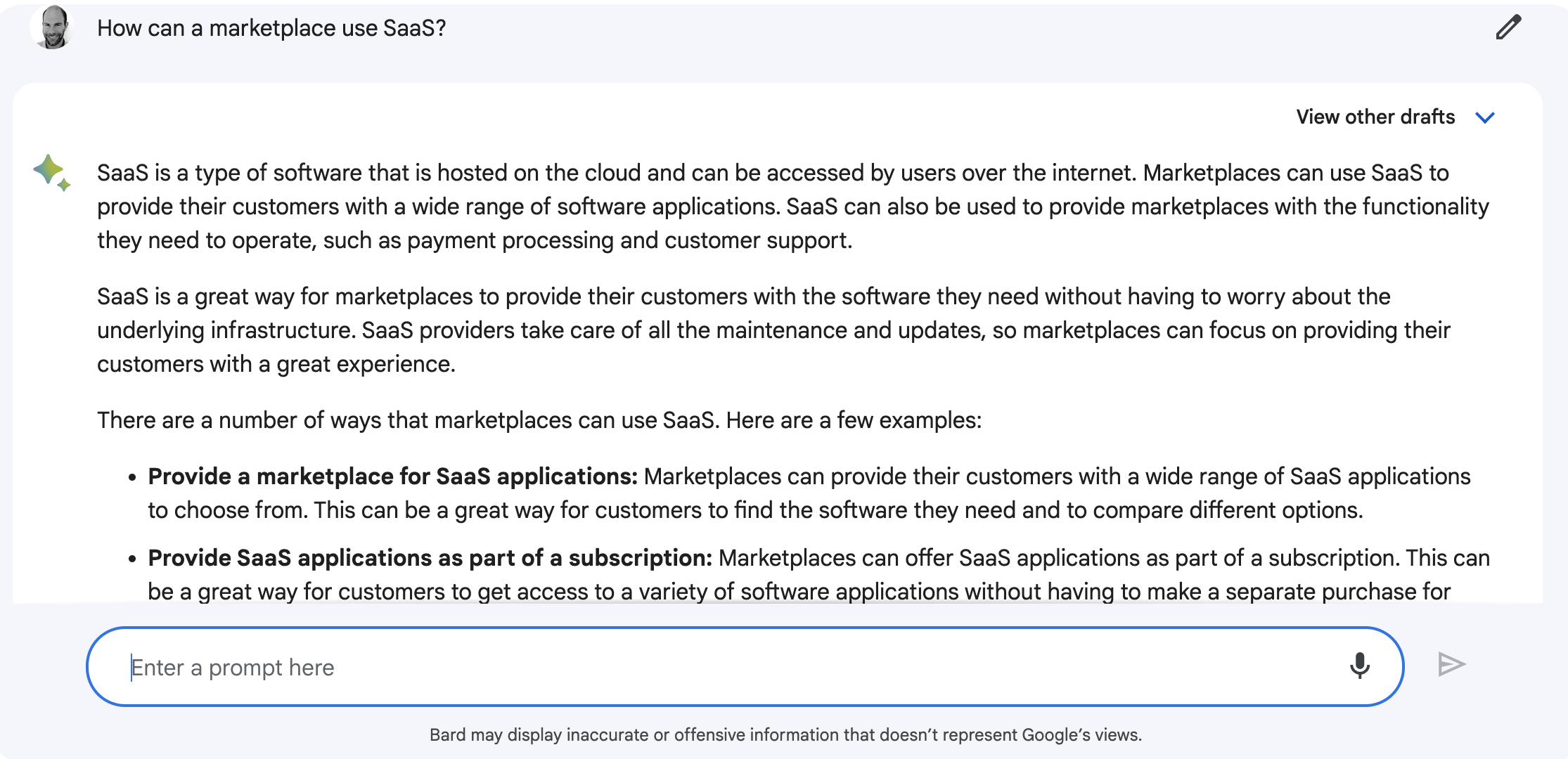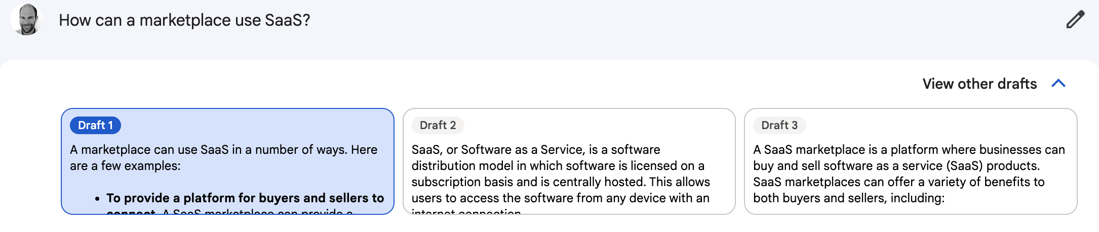 Each draft provides a slight different answer, but based on the same information. I like that I can ask for another response to my question, which I can then view in different drafts. Struggling to compare the different drafts at a glance: Alternatively, I can Google an alternative response 🙂
