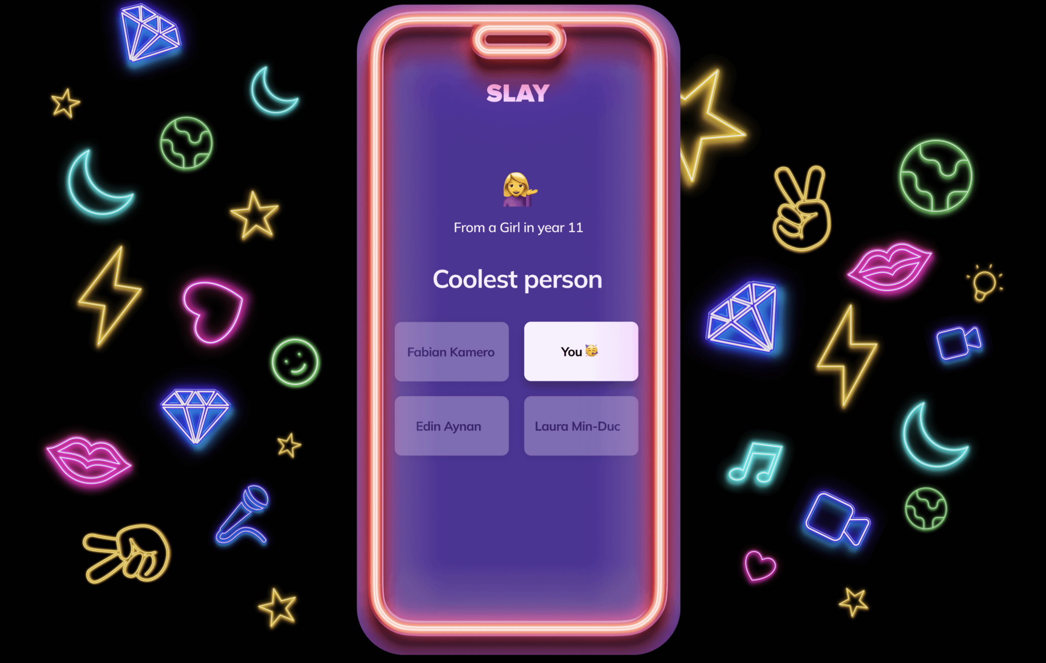 Naturally, I’m not the target audience of the W App, but once the user has found their school and connected with friends, the app shows twelve questions, which the user can only answer by choosing another user to pay a compliment to (or “slay”). The user that they pay a compliment to – anonymously – can be from their school, class, or peer group.