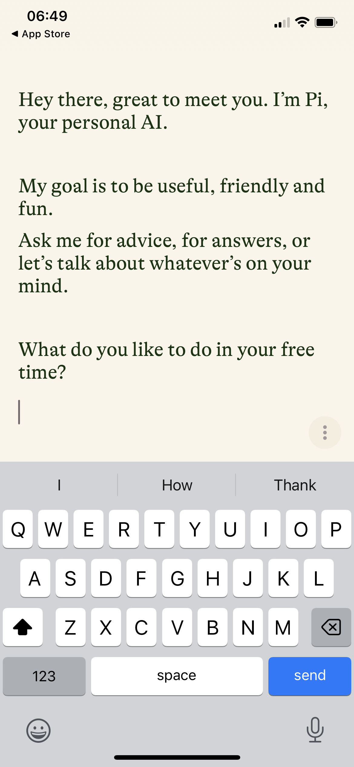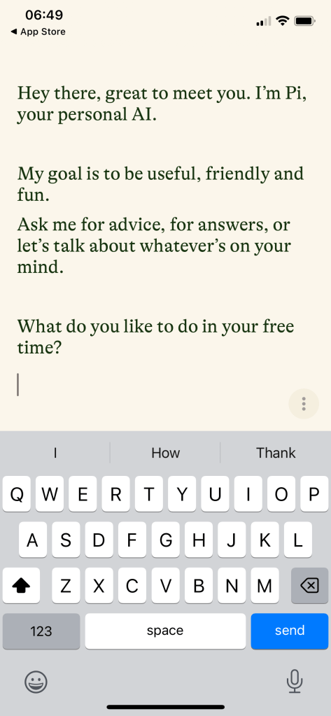 How does Pi explain itself in the first minute? “Pi, your personal AI” is what it says in the App Store. There are examples of the kind of questions and pieces of advice that I can ask Pi about.