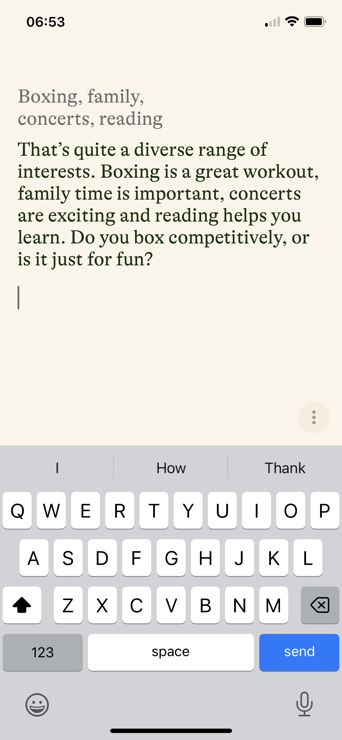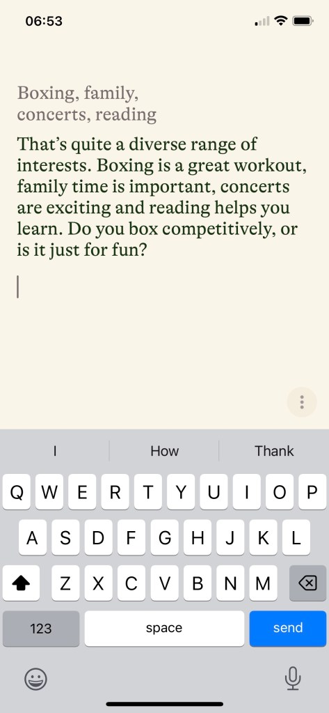 How does Pi work? I start by answering Pi’s question about what I like doing in my free time. This triggers a conversation with Pi, with it asking me about my activities.