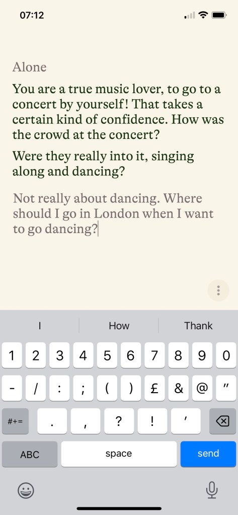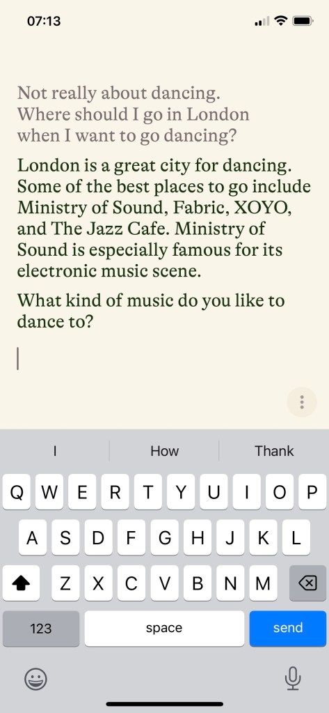 So I ask about places in London to go dancing, and Pi gives me some good tips. I can see how I could use Pi in future to get mortgage advice, tips on how to raise my kids or help me out when my flight is delayed.