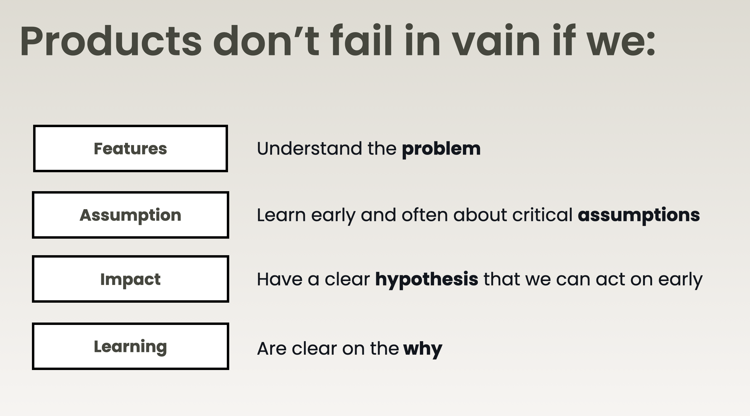The faster we can work through the different components of the F.A.I.L. framework the bigger the chances of our products not failing in vain. We need to make sure that a chosen problem is indeed worth solving, we test our critical assumptions early often and that we established desired impact and learnings from the offset.