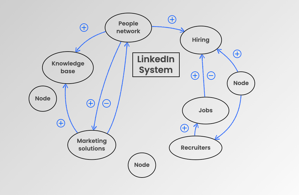If we take LinkedIn as another good example of a system and zoom out, we see that the big picture consists of several nodes. For example, the hiring that happens through LinkedIn is a system in its own right and so are the marketing solutions available through LinkedIn.