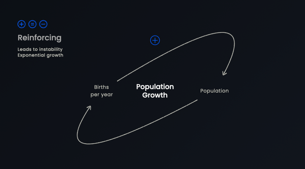 In systems there are two types of feedback loops: reinforcing and balancing. A reinforcing feedback loop means that the cause and effect loop causes something to increase. This can be something that we want to optimise within a system, but the risk is that it will ultimately lead to instability. If the number of births per year goes up, the population will increase, which in turn will cause the number of births per year to grow.