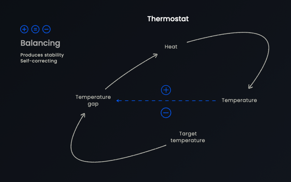 In contrast, a balancing feedback loop is self-correcting and aims to stabilise. Instead of letting an increasing effect get out of hand, a balancing feedback loop will self-correct. We can use or create balancing feedback loops to reduce points of friction within a system.