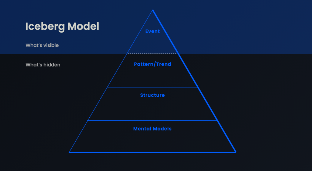 What we’re doing in Systems Thinking is understanding the relationships between the different nodes that constitute a system. Through the Iceberg Model we can gain a below-the-surface perspective. We witness and event, and then we explore what sits underneath that; the patterns, structures and mental models that underpin the event.
