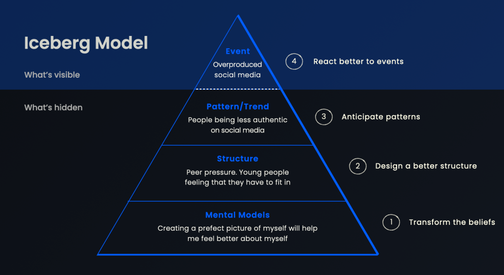 Applying the Iceberg Model to the “overproduced social media” event, you can then see how a product like BeReal taps into this Iceberg Model example, and has been designed to encourage people to be more authentic on social media.