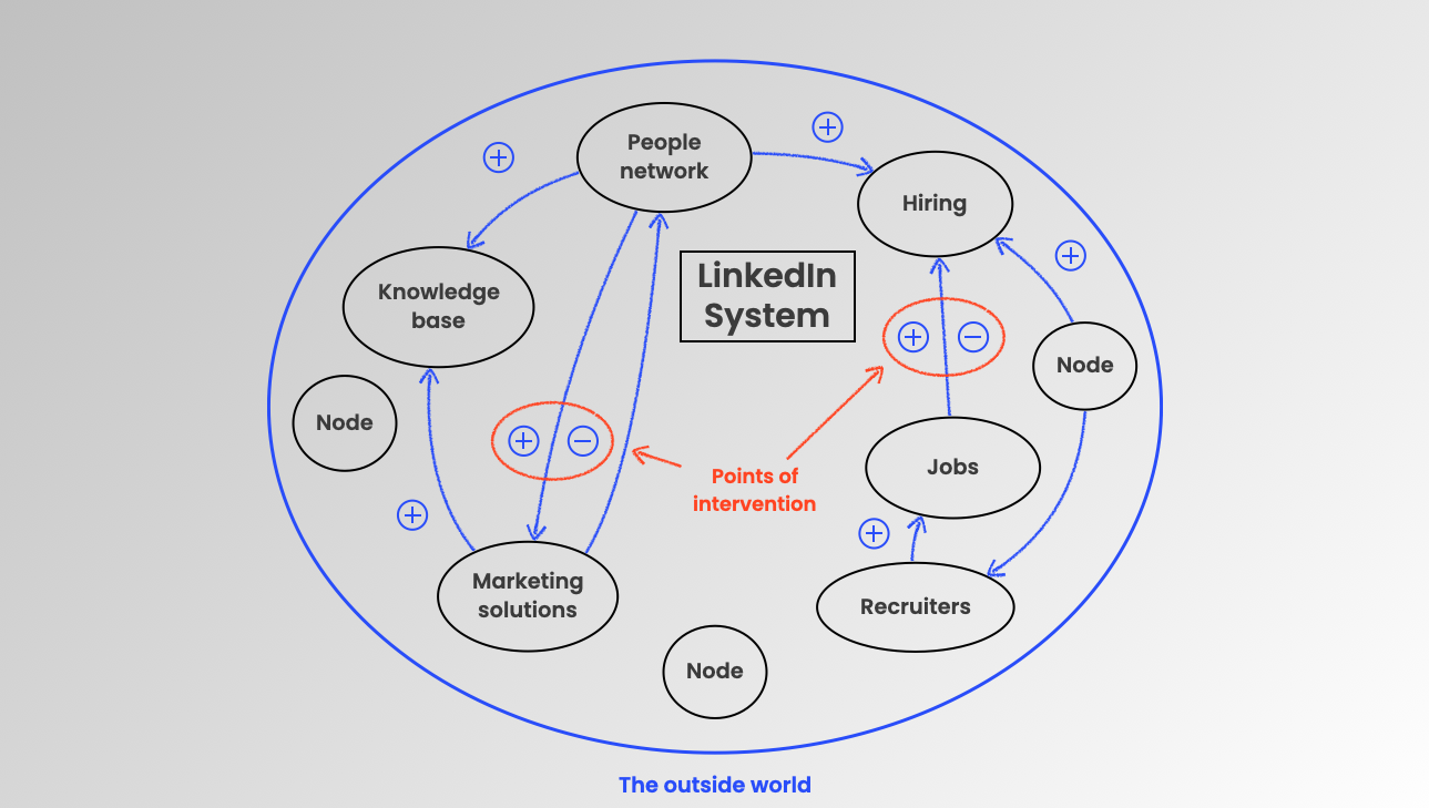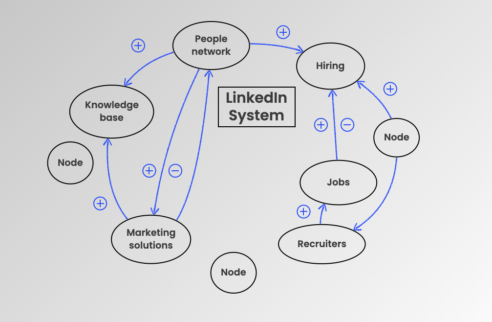 If we take LinkedIn as another good example of a system and zoom out, we see that the big picture consists of several nodes. For example, the hiring that happens through LinkedIn is a system in its own right and so are the marketing solutions available through LinkedIn.