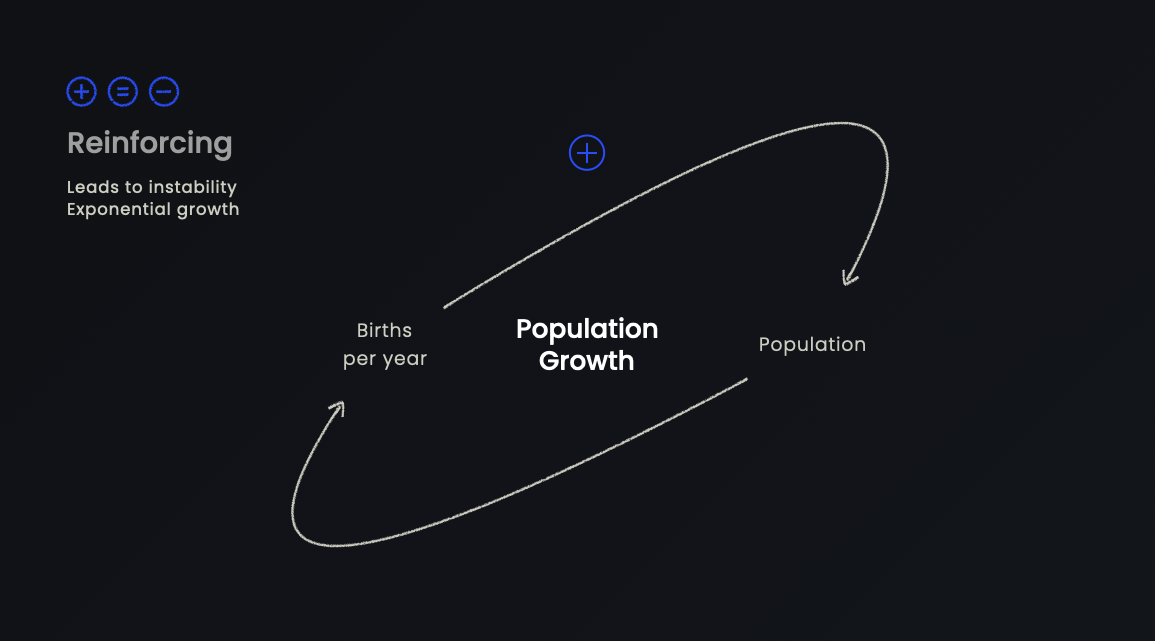 In systems there are two types of feedback loops: reinforcing and balancing. A reinforcing feedback loop means that the cause and effect loop causes something to increase. This can be something that we want to optimise within a system, but the risk is that it will ultimately lead to instability. If the number of births per year goes up, the population will increase, which in turn will cause the number of births per year to grow.