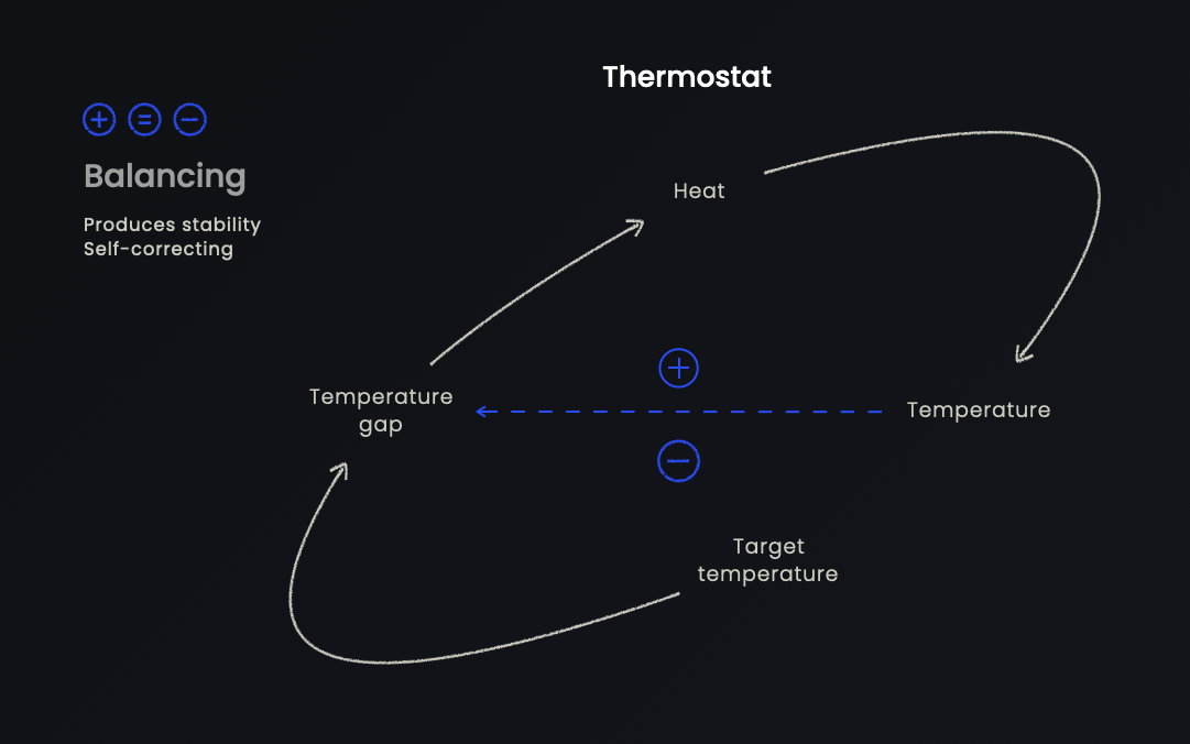 In contrast, a balancing feedback loop is self-correcting and aims to stabilise. Instead of letting an increasing effect get out of hand, a balancing feedback loop will self-correct. We can use or create balancing feedback loops to reduce points of friction within a system.