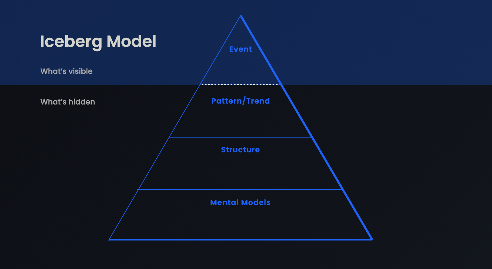 The Iceberg Model is one of three ways to zoom into a system, along with feedback loops and flow diagrams. By zooming in and out of a system we can identify points of friction that we want to reduce or opportunities that we want to optimise.
