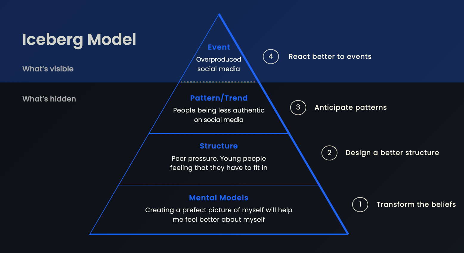 Applying the Iceberg Model to the “overproduced social media” event, you can then see how a product like BeReal taps into this Iceberg Model example, and has been designed to encourage people to be more authentic on social media.