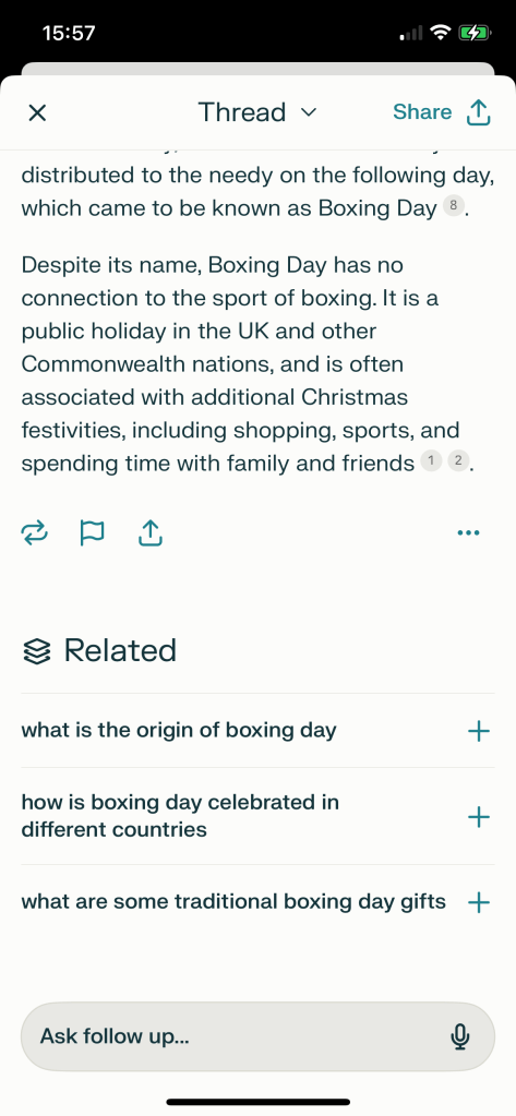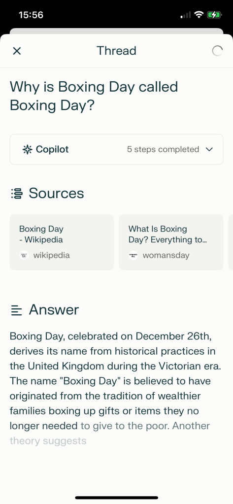 Perplexity’s interface allows users to ask follow up questions. It also addresses the lack of transparency inherent in a lot of AI output by highlighting the sources as well as the steps the copilot took to arrive at the answer in question.
