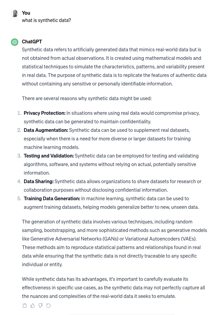 I recently heard Anjney Midha – General Partner at Andreessen Horowitz – talking about synthetic data. I could sense synthetic data has to do with AI, but not much more beyond that. So what does any self respecting product person do in such a situation?! Ask ChatGpT of course!