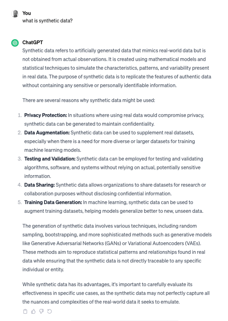 My main takeaway from reading ChatGpT’s answer is that synthetic data isn’t based on actual, personally identifiable data. Synthetic data has been created artificially (via algorithms or generative AI) instead of being derived from real-word events or behaviours. It means that the data is created by analysing information from any data source, detecting structures and patterns. This analysis is then used to create a new dataset that mimics the main characteristics of the original data analysed.