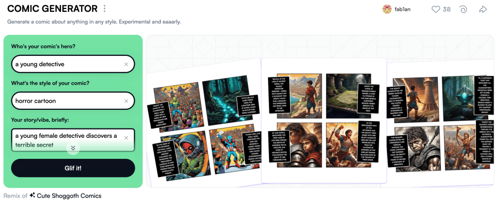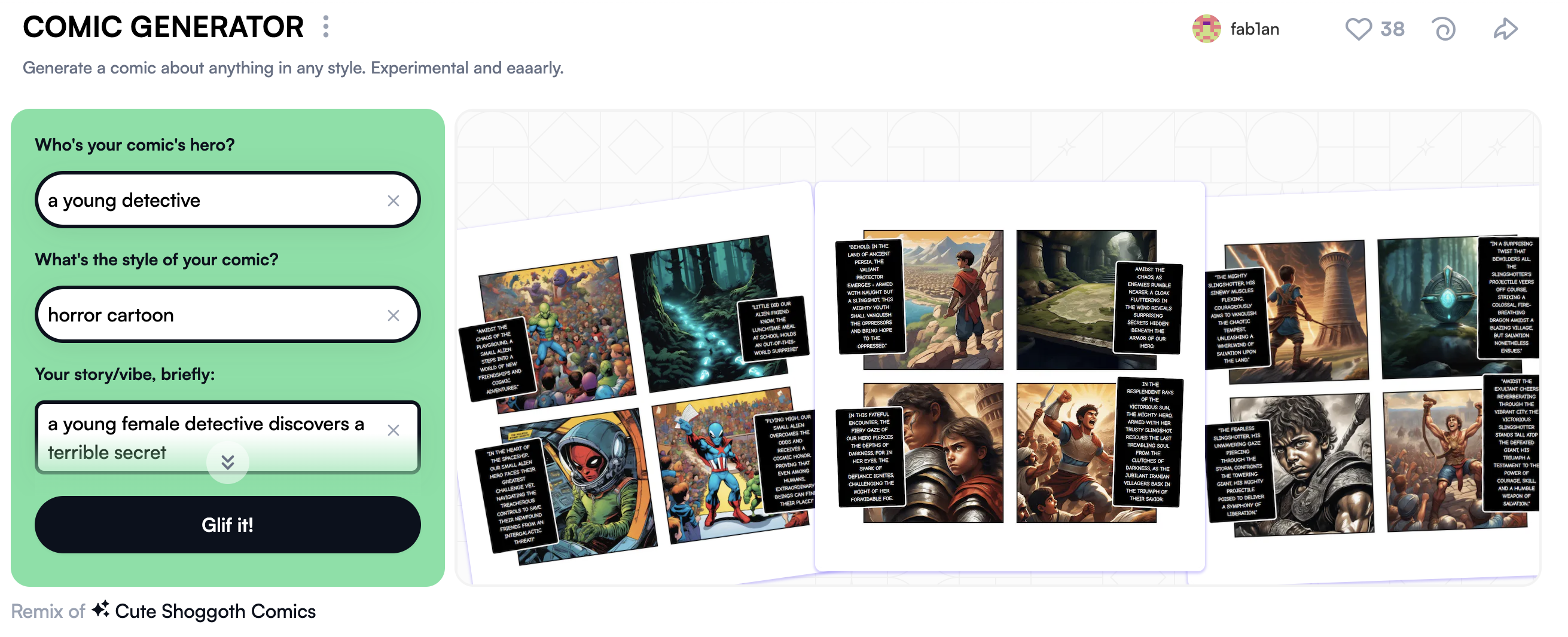 How does Glif work? Take the comic generator created by “fablan” for example: I can build my own comic based on his comic generator, by entering my comic’s hero, the style of my comic and my storyline.