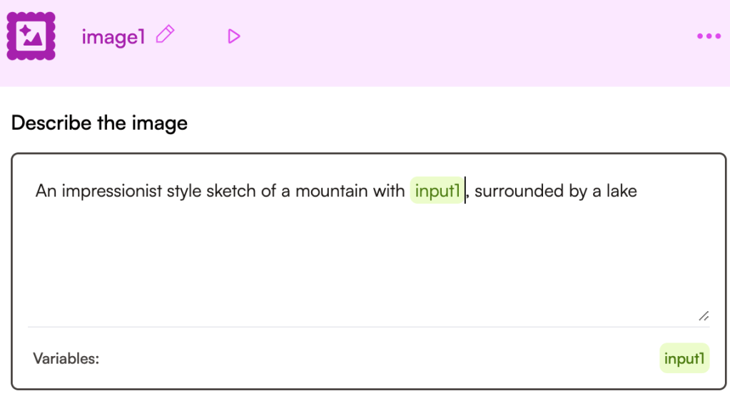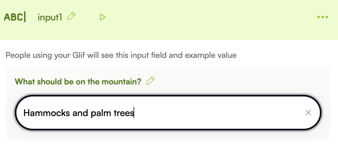 Through the text input function, users of my image can change part of the text prompt to change the image output. I can enable them to change what should be on the mountain image that I’ve created, setting “hammocks and palm trees” as a default.