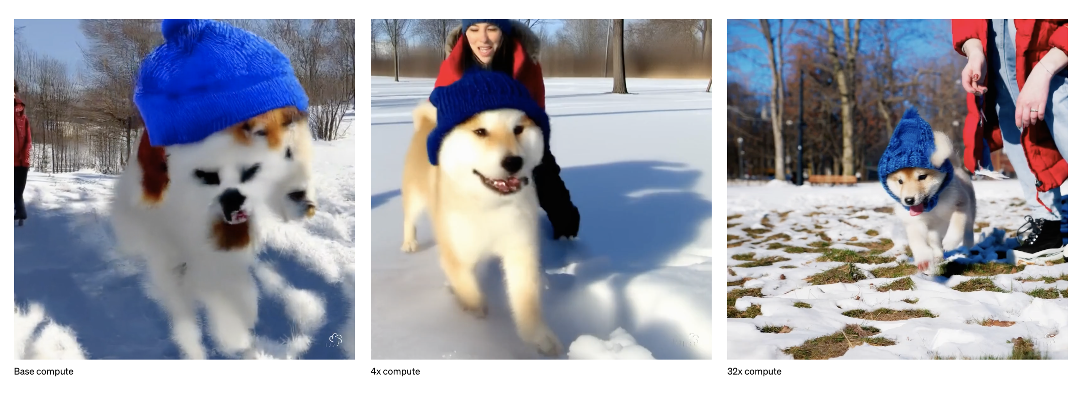 OpenAI uses a transformer based architecture to create high resolution video. OpenAI research shares a comparison of video samples below, each sample having fixed seeds and inputs as training of the data progresses. The quality of each sample improves dramatically as training compute increases.