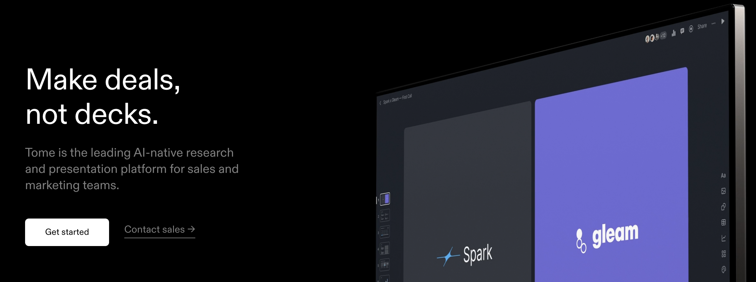 How does Tome explain itself in the first minute? “Make deals, not decks” is the main line on the Tome website, explaining how “Tome is the leading AI-native research and presentation platform for sales and marketing teams.”