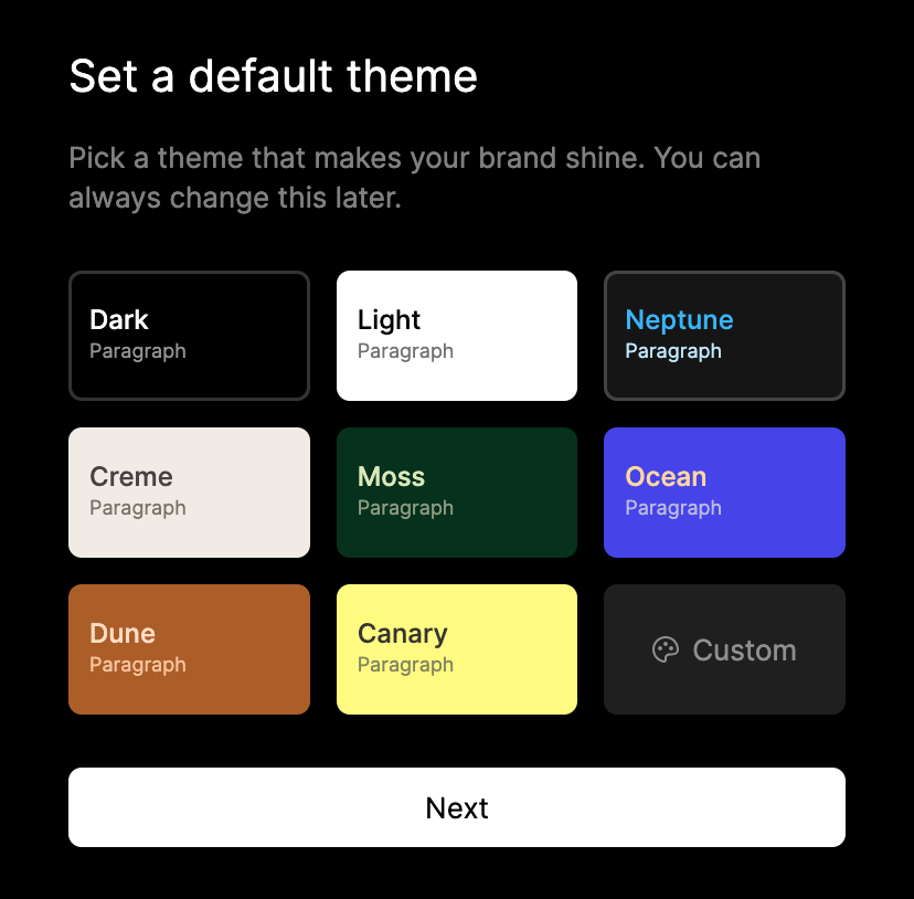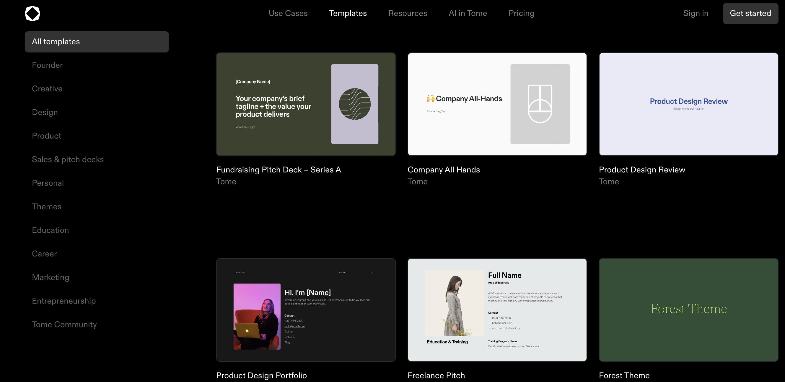 Tome offers a large set of out of the box templates that can be used to kickstart a presentation. These templates cover a wide range of use cases, from sales pitch to press kit.