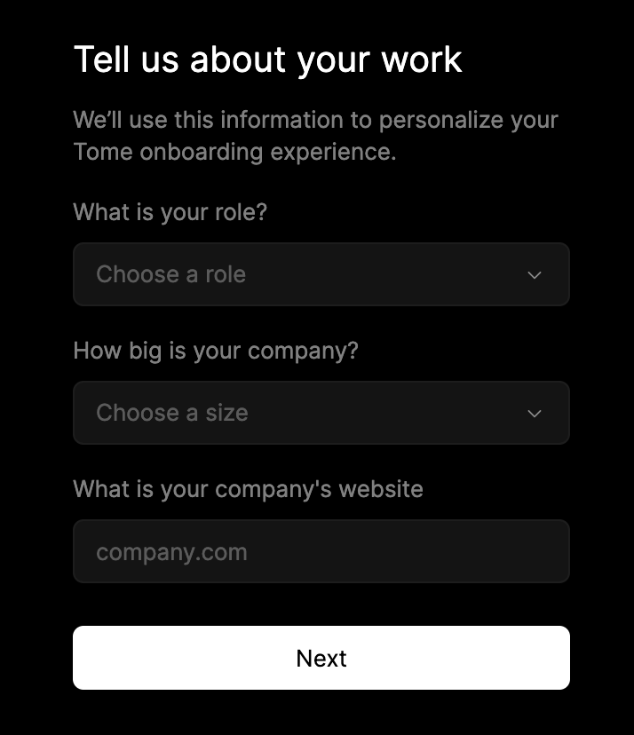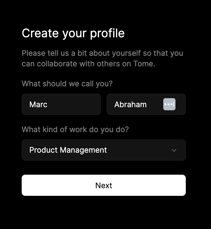 How does Tome work? Onboarding onto Tome feels pretty standard: I create my profile, and provide some professional data to help Tome personalise my experience.