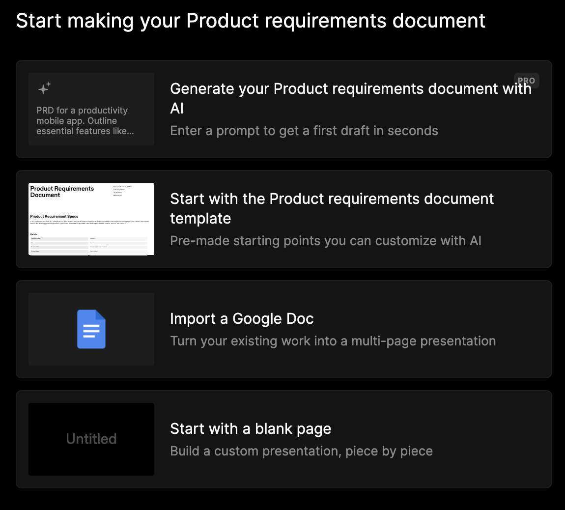 When I select the use case, a few options appear. Unfortunately, the first option – “Generate your Product requirements document with AI” – is only available on Tome’s paid option, Tome Pro.