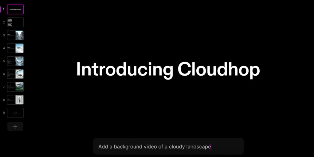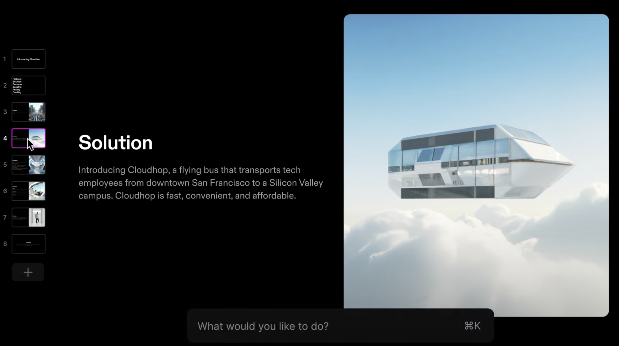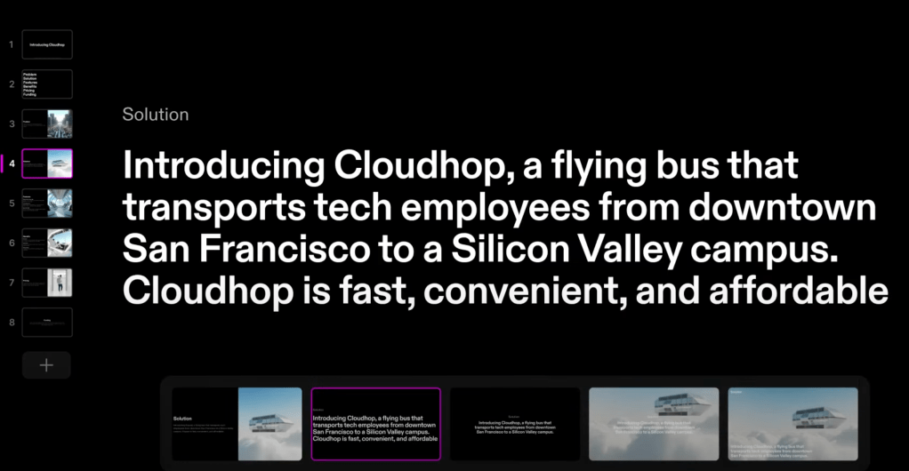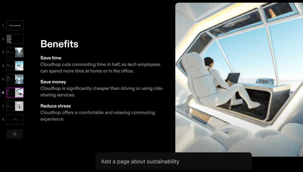 Tome will generate a first version of the presentation quickly, based on the template for a specific use case. You can then provide prompts on how you’d like to change the presentation layout, for instance. Tome will share alternative layout solutions to choose from.