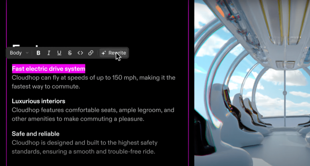 Common to many AI applications Tome offers rewrite functionality as well as as the ability to add extra content on the fly. This additional content can be a new page or a video.