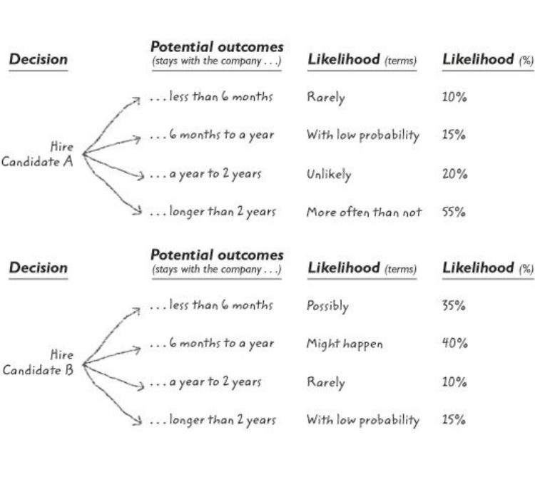 - Probabilities – Estimate the likelihood of each outcome materialising. Such estimations will be based on guesses and Duke stresses that good decision-making requires a willingness to guess. Educated guesses are based on information, and we need to ask two questions when guessing. Firstly, what do you already know that will make your guess more educated? Secondly, what can you find out that will make your guess more educated?
