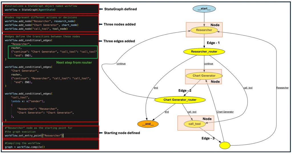 • LangGraph – LangGraph is an open source orchestration framework for agentic systems (see example from Kamal Dhungana below). It’s an open source framework built on top of LangChain, which provides a standard interface to interact with models and other components, useful for straight-forward chains and retrieval flows. CrewAI is another open source agent collaboration framework built on top of LangChain.