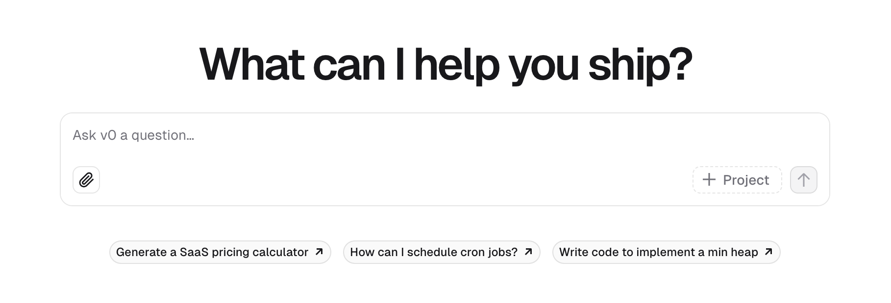 How does V0 explain itself in the first minute? “What can I help you ship?” followed by a prompt generator to start creating my first prototype on V0.
