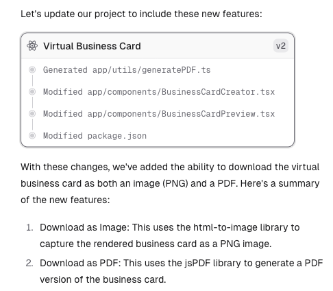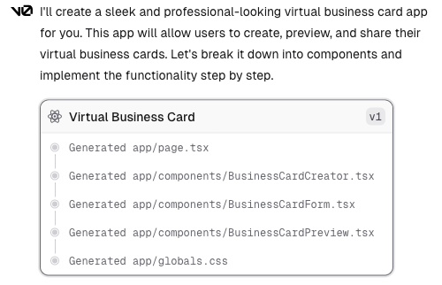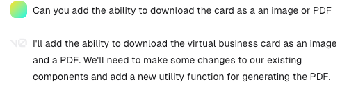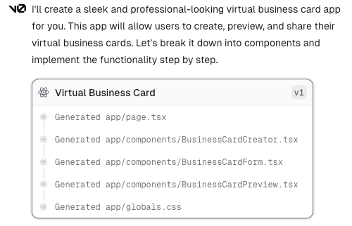I like how V0’s agent tells me about the features of the app I’ve asked it to create and shares suggestions on how to improve the app: