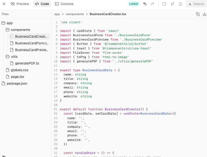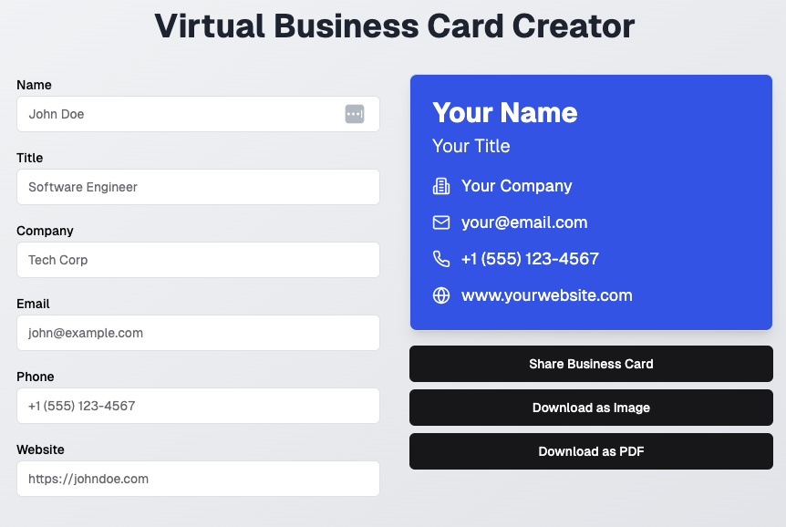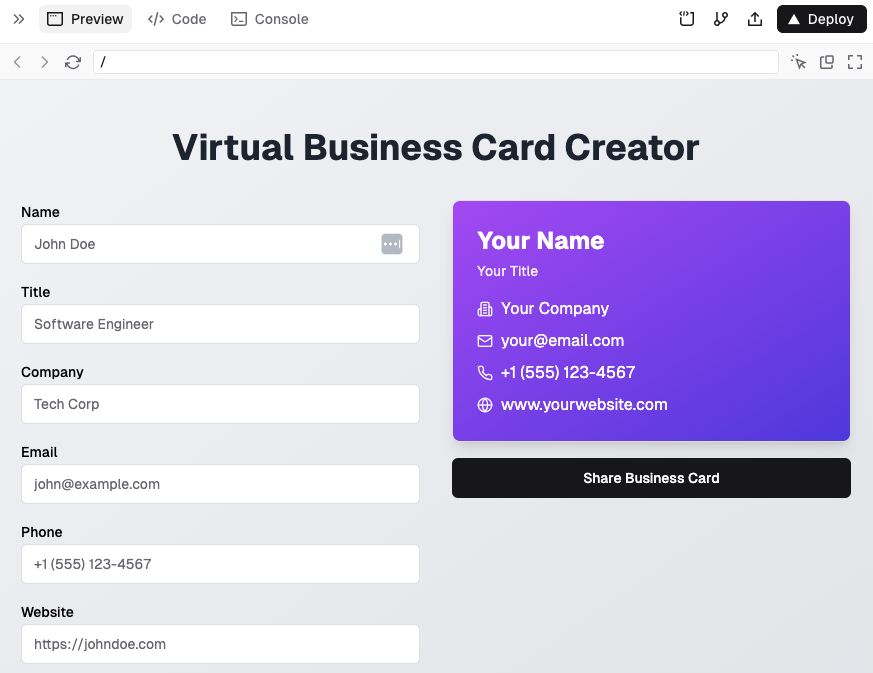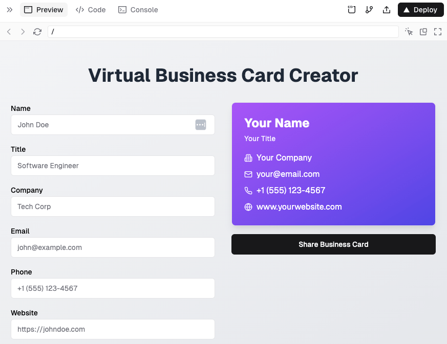 • A “Share Business Card” button that simulates generating a unique link for the card.