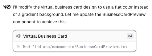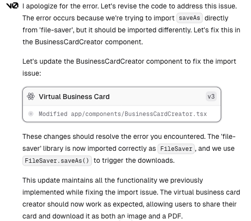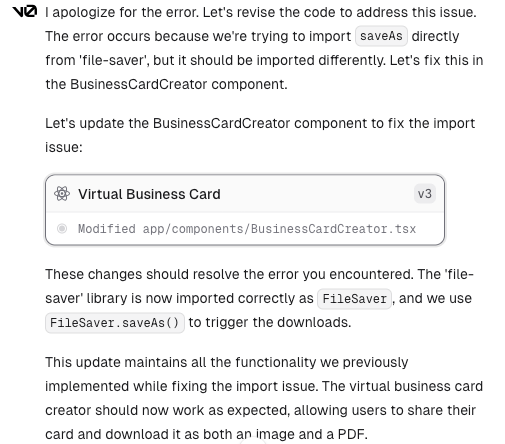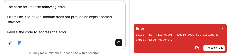 I learn as much about a product from the way in which it handles errors as I do from playing with its capabilities. In this instance the “Fix with V0” button automatically generates a prompt to revise the code to resolve the specific error: