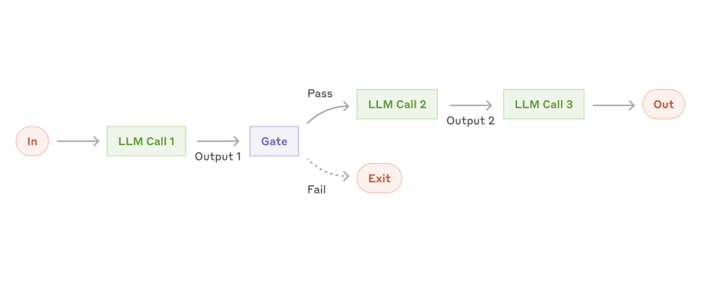 - Workflow: prompt chaining – Prompt chaining breaks down a task into a sequence of steps where each LLM processes the output of the previous one. Prompt chaining can be used for tasks such as writing a document outline, checking that the outline meets set criteria and then writing the document based on the outline (see below diagram as a nice example of a prompt chaining workflow).