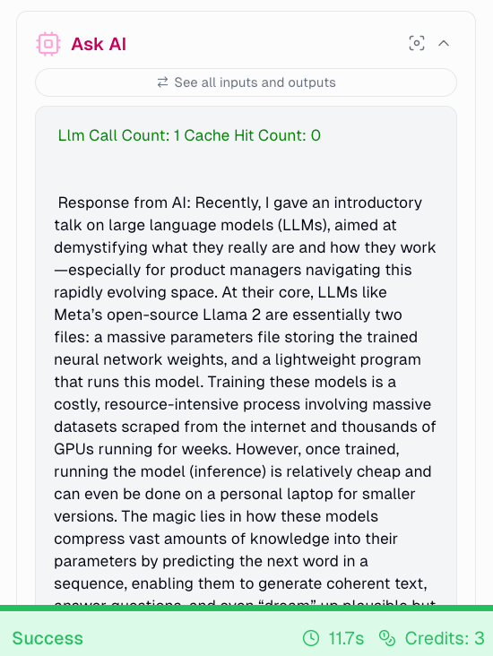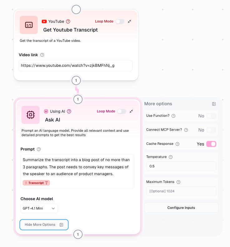 I then used a transcript node to generate a transcript of using Andrej Karpathy’s Intro to Large Language Models talk. Next, I added an Ask AI node to transform that transcript using an LLM of my choice. For straightforward automations, choose smaller, cheaper AI models to keep costs down.