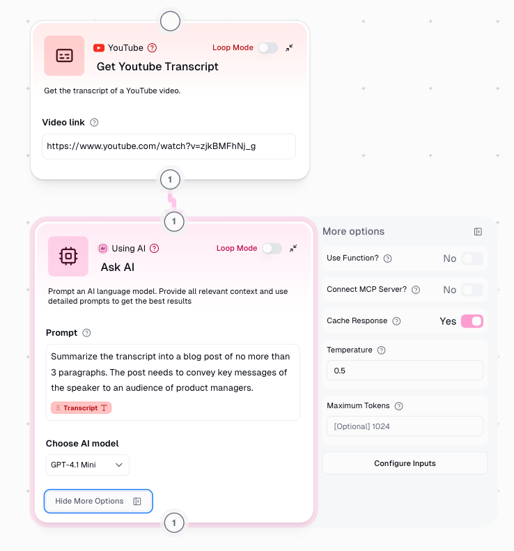 I then used a transcript node to generate a transcript of using Andrej Karpathy’s Intro to Large Language Models talk. Next, I added an Ask AI node to transform that transcript using an LLM of my choice. For straightforward automations, choose smaller, cheaper AI models to keep costs down.