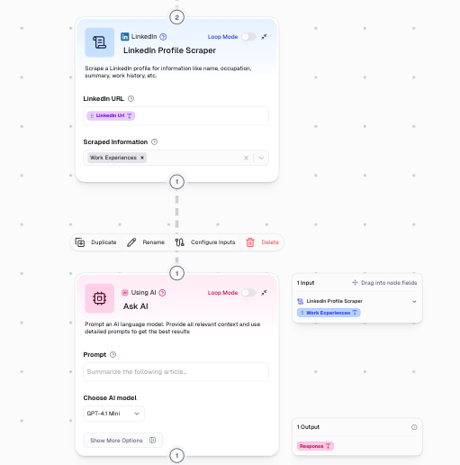 Main learning point: I’m constantly searching for automation tools that are foolproof and intuitive, hoping to automate flows without much thought. Even with Gumloop’s user-friendly interface, I was reminded that successful automation still requires crystal-clear thinking about your desired workflow. Even with a tool that feels as intuitive as Gumloop, the onus is still on me to have clarity about the process I want to automate and the outputs I want it to generate.