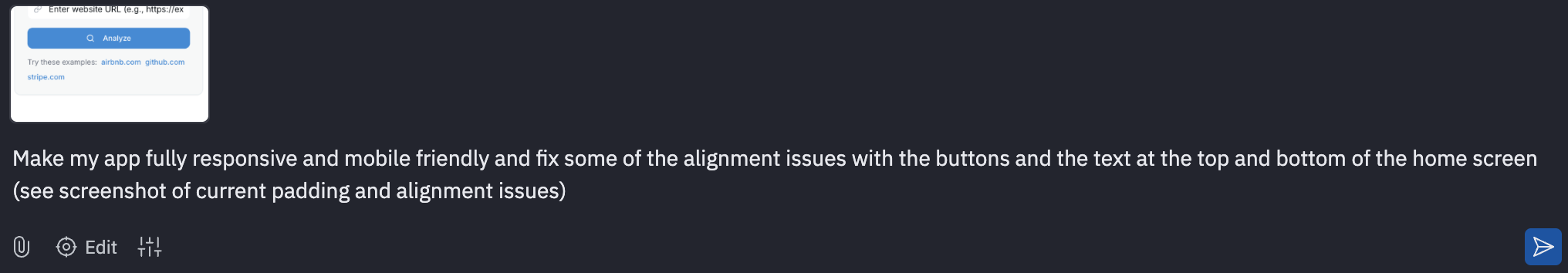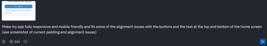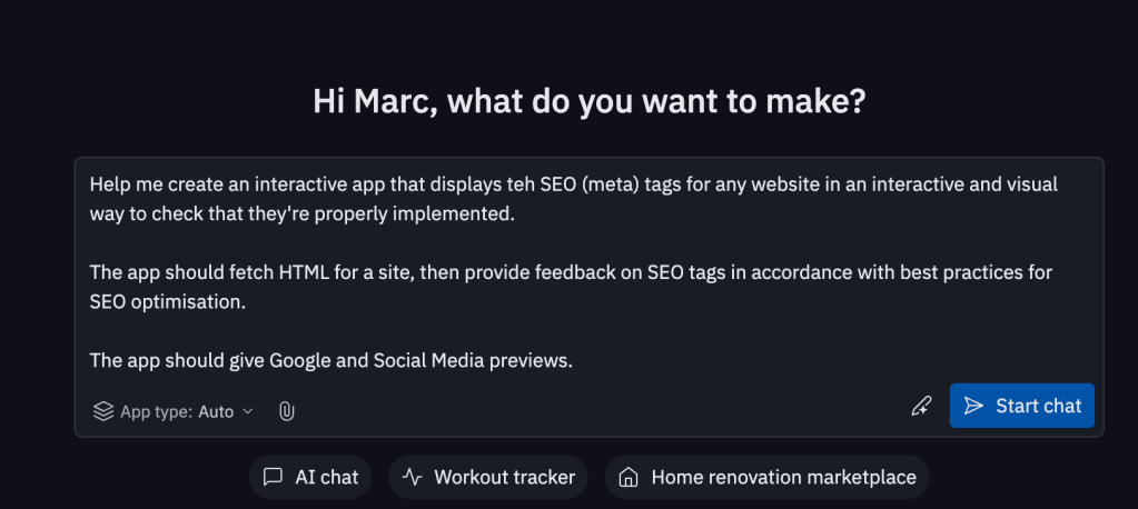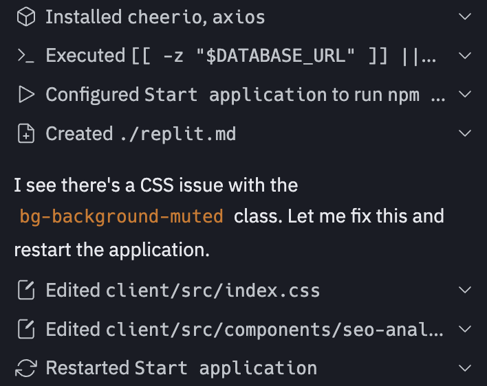 I started building an SEO Analyser with a simple prompt in Replit: “Create an SEO analysis tool that can evaluate website performance and provide actionable insights.”
